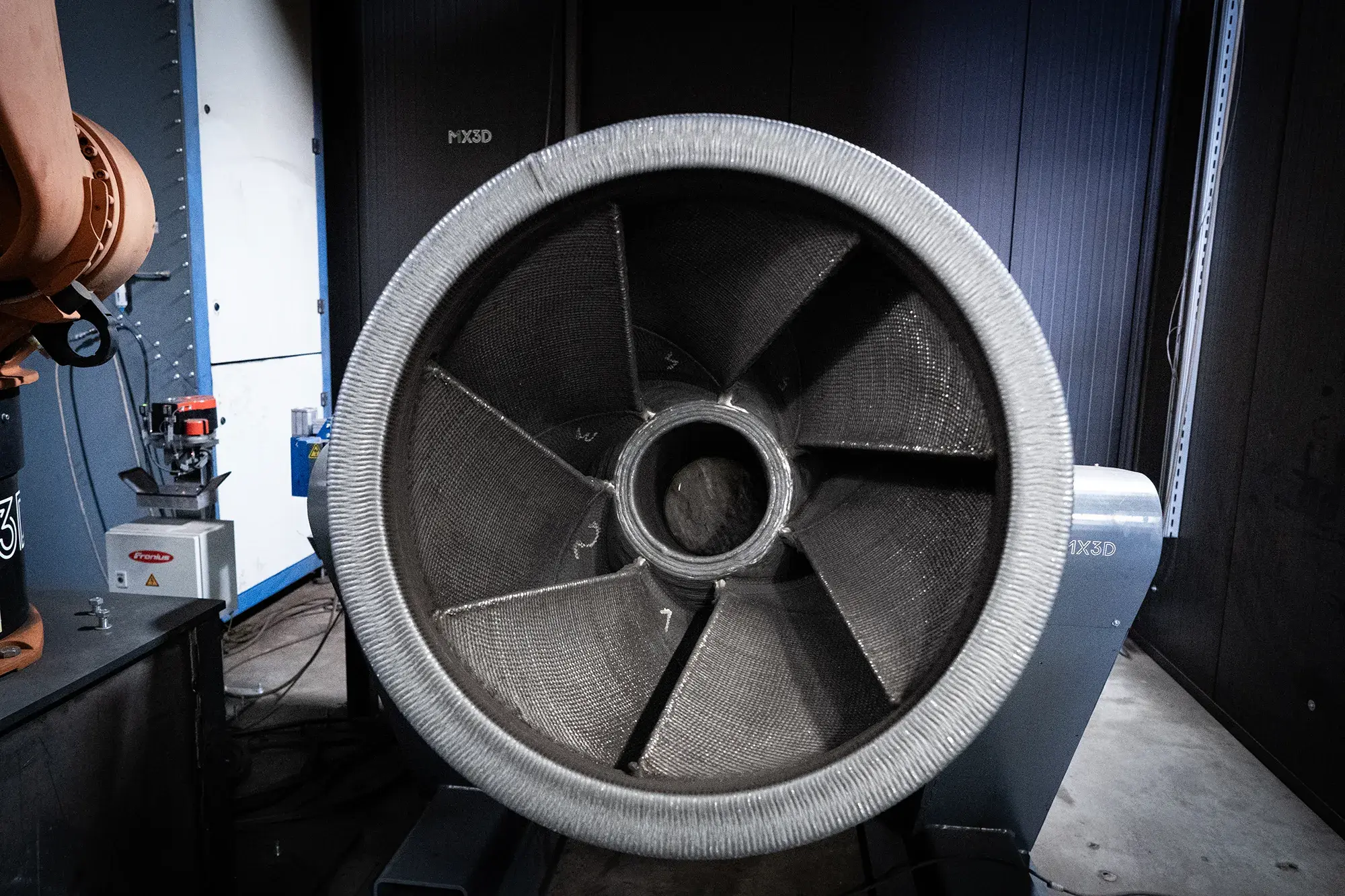To accommodate the impeller’s total weight of approximately 1.4 to 1.5 tons, MX3D equipped its MX Metal AM Machine with a high-payload 2-axis manipulator, enabling controlled rotation and accessibility during printing.