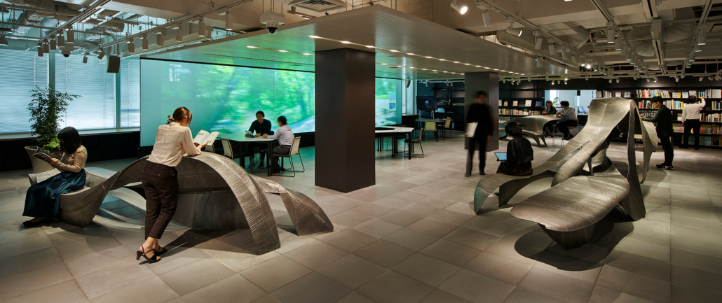 “We wanted to create lumps of light and soft shapes that would fit the human posture, by using the material and expression which were the furthest away from that image, and eventually were able to create works, abstract and yet making you feel like touching them, in a space aimed at accumulating knowledge.” – Hiroshi Hasegawa, Takenaka Corporation