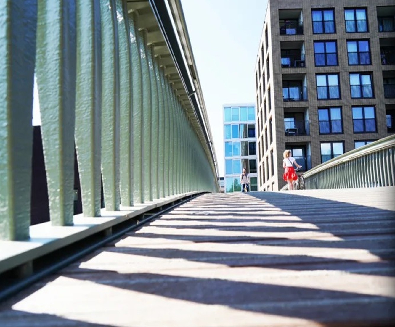The Solstice Bridge is designed by Cyrus Clark, an architect for the city of Amsterdam. The pedestrian bridge spans 30 meters long over the Oostenburgervaart, a canal on the east side of the city centre. The search for a uniquely defining design element led to the concept of 360 subtly different handrail balustrade poles, each one slightly different from the previous one in a transitioning motion.