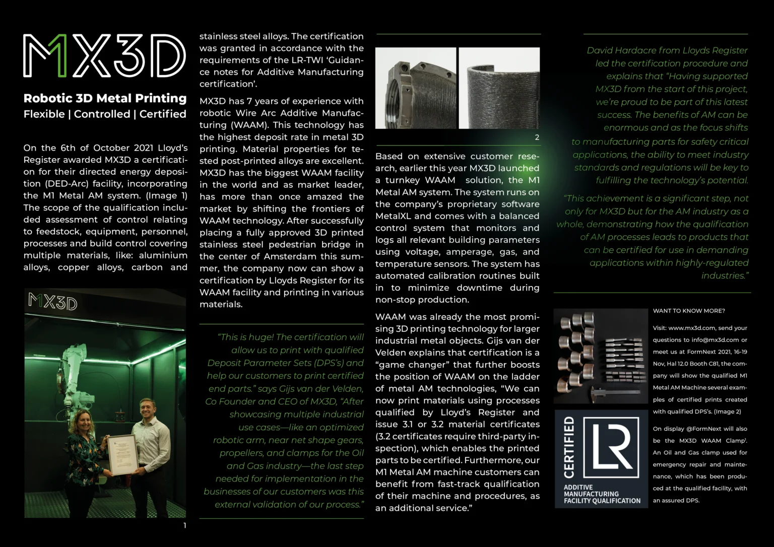 News Lloyd’s Register awarded MX3D a certification for their directed energy deposition (DED-Arc) facility, incorporating the M1 Metal AM system